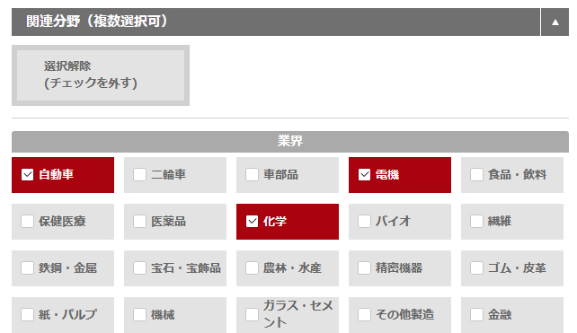 検索結果の表示後、キーワードはそのままで、関連国・地域、関連分野を変えて検索できます。