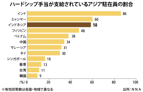 インドネシアハードシップ手当支給58%NNA調査、アジアで高水準PICK UP経済マクロ経済保健医療不動産陸運日系企業のインドネシア駐在員の58%が、衛生や治安など生活環境が厳しい国・地域が対象となる「ハードシップ手当」を支給されていることが、NNAの福利厚生調…