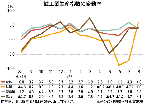 インド8月の鉱工業生産指数、前年比4.0%上昇経済マクロ経済統計化学一般鉄鋼・金属その他製造石油・石炭・ガス鉱業電力・ガス・水道インド統計・計画実施省が9月29日に発表した2025年8月の鉱工業生産指数(IIP、2011/12年度=100、速報値)は151.7で、前年同月に比べて4.0%上昇した。上昇…