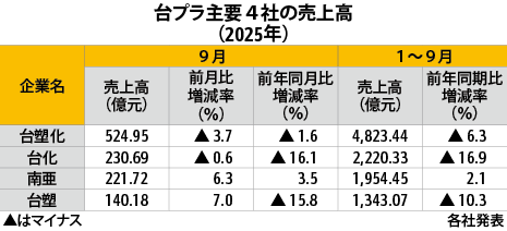 台湾台プラ4社、9月は3社が前年同月比で減収化学決算化学一般石油・石炭・ガス台塑関係企業(フォルモサプラスチックグループ、台プラ)主要4社が13日発表した2025年9月の連結売上高は、南亜塑膠工業(ナンヤプラスチック、南亜)を除く3…