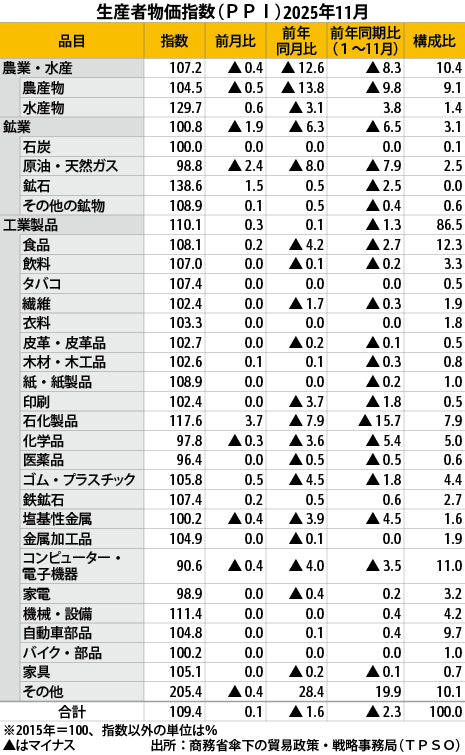 タイ11月の生産者物価、10カ月連続マイナス経済マクロ経済統計食品・飲料鉄鋼・金属その他製造精密機器農林・水産車部品 タイ商務省の貿易政策・戦略事務局(TPSO)が3日発表した11月の生産者物価指数(PPI、2015年=100)は109.4となり、前年同月比1.6%下落した。10カ月…