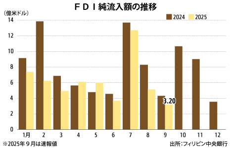 フィリピンFDI純流入額、9月は26%減の3億ドル経済マクロ経済統計金融一般フィリピン中央銀行は10日、9月の海外直接投資(FDI)の純流入額(速報値)が、前年同月比25.8%減の3億2,000万米ドル(約500億円)だったと発表した。4カ…