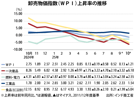 インド10月卸売物価1.21%下落、3カ月ぶりマイナス経済マクロ経済統計食品・飲料化学一般鉄鋼・金属その他製造農林・水産石油・石炭・ガス鉱業電力・ガス・水道卸売り小売りインド商工省が14日に発表した2025年10月の卸売物価指数(WPI、11/12年度基準)は154.8となり、前年同月比で1.21%下落した。上昇率がマイナスになるのは7月…