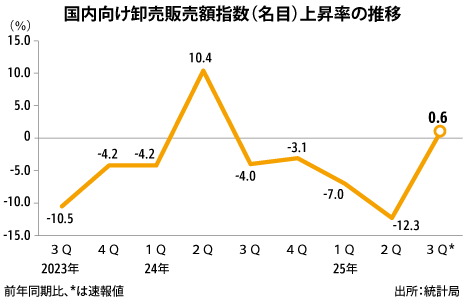 シンガポール3Q卸売販売0.6%上昇、5カ月ぶりプラス商業統計卸売り シンガポール統計局が20日に発表した2025年7~9月期の国内向け卸売販売額指数(17年=100、名目、速報値)は95.1となり、前年同期比で0.6%上昇した。12.3%…