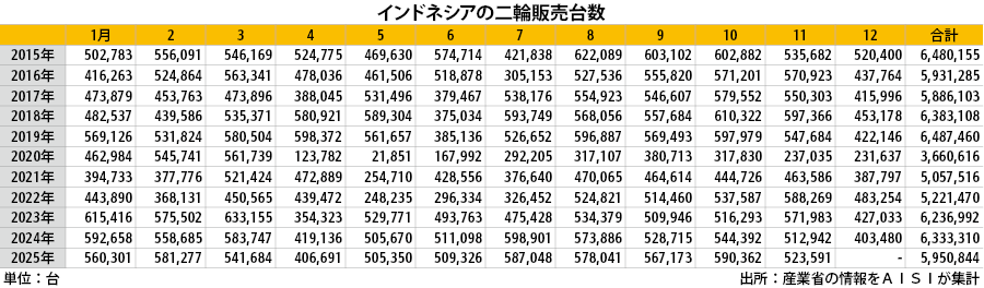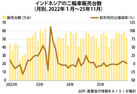インドネシア11月の二輪販売、2.1%増の52万台超車両統計二輪車 インドネシア二輪車製造業者協会(AISI)によると、11月の加盟5社の国内二輪車販売台数は前年同月比2.1%増の52万3,591台だった。4カ月連続で前年を上回…