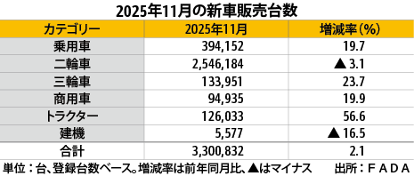 インド自動車小売り、11月は2%増今後3カ月、7割強「成長」予想車両統計自動車二輪車インドの自動車販売店協会連合(FADA)は8日、2025年11月の新車販売台数(登録台数、トラクター、建機含む)が前年同月比2%増の330万台だったと発表した。…