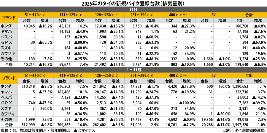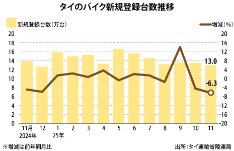 タイ11月の新規バイク登録、6.3%減の13万台PICK UP車両統計二輪車 タイ運輸省傘下の陸運局は、11月の二輪車の新規登録台数が前年同月比6.3%減の12万9,640台だったと発表した。2カ月連続で前年同月を下回った。 ブランド別で…