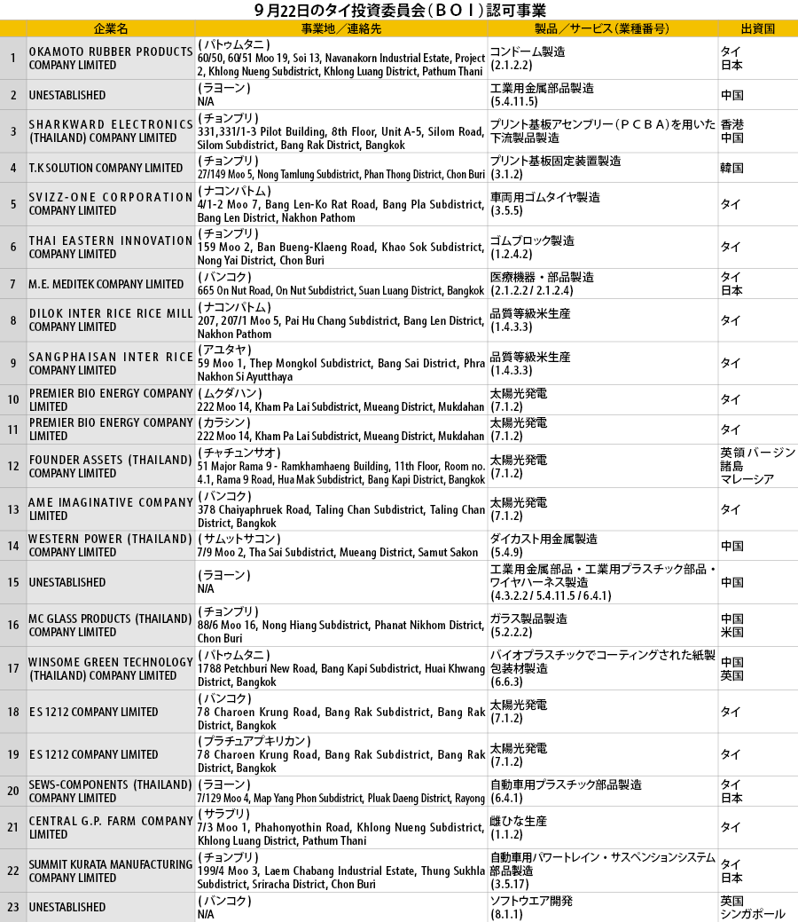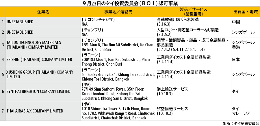 タイ9月23日のタイ投資委員会認可事業(7件)経済マクロ経済設備投資政策・法律・規制タイ投資委員会(BOI)は9月23日の会議で7件の事業を認可した。事業の出資国・地域別(1つの事業に複数の国・地域が出資するケースを含む)では、シンガポ…