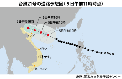 ベトナム台風、6日午前に北東部に上陸か安全情報社会災害中国・雷州半島の東の沖合にある台風21号(国際名:マットゥモ)は5日午前時点で南シナ海を北西に進んでおり、6日午前中にもベトナム北東部に上陸する見込みだ…