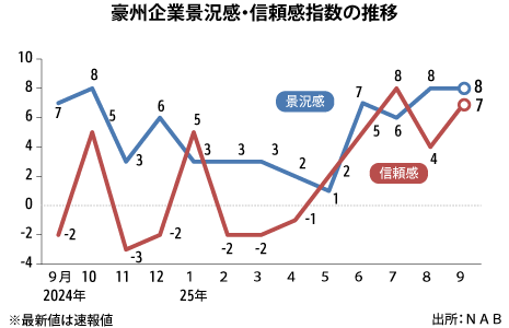 オーストラリア豪9月の企業景況感と信頼感、長期平均超え経済マクロ経済統計雇用・労務ナショナル・オーストラリア銀行(NAB)が14日に発表したオーストラリアの企業信頼感(Business Confidence)指数は、9月に7と前月から3ポイント上昇し、前…