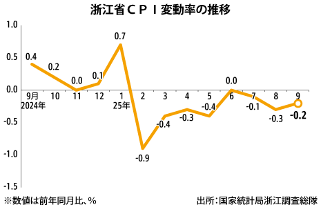 中国浙江浙江の9月CPI、0.2%下落経済マクロ経済統計国家統計局浙江調査総隊が発表した浙江省の2025年9月の消費者物価指数(CPI)は、前年同月比で0.2%下落した。3カ月連続でのマイナスで、下落率は前月から0…