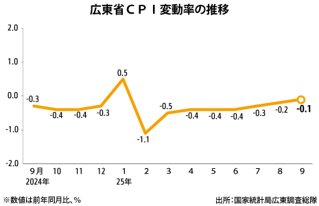 中国広東広東省の9月CPI、8カ月連続のマイナス経済マクロ経済統計 国家統計局広東調査総隊によると、広東省の2025年9月の消費者物価指数(CPI)は前年同月比0.1%下落した。マイナスは8カ月連続。 CPIを構成する8項…