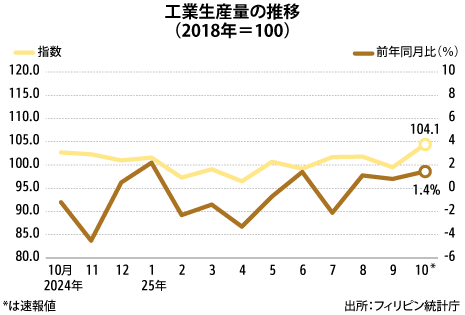 フィリピン10月工業生産、量・額とも3カ月連続プラス経済マクロ経済統計その他製造 フィリピン統計庁(PSA)が9日発表した主要工業総合調査(MISSI、速報値)によると、10月の工業生産量は前年同月比1.4%増、工業生産額は同1.7%増だ…