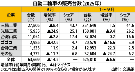 台湾9月の二輪車販売、前年同月比14.5%減車両統計二輪車NEW台湾交通部(交通省)によると、二輪車の2025年9月の新車販売台数(ナンバープレート交付ベース)は前年同月比14.5%減の6万3,669台だった。前年同月比のマイナ…