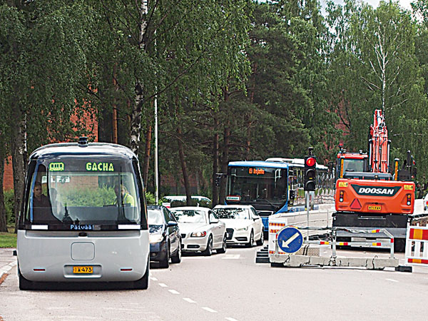 実証が行われたのは工科系のアールト大学キャンパス内の公道。地下鉄の駅から最も遠い研究棟までは1キロ離れている。乗り込んできた大学院生らは「バスを見た時、なんだろうと思ったが、気軽に乗れる雰囲気がいい」「内装に温かみを感じる」と感想を語っていた。