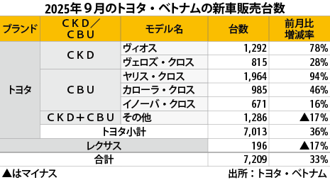 ベトナムトヨタ9月販売1%増、9カ月連続でプラス車両自動車 トヨタ自動車のベトナム現地法人トヨタ・モーター・ベトナム(TMV)が1日発表した9月の新車販売台数(レクサス含む)は前年同月比1%と微増、前月比33%…