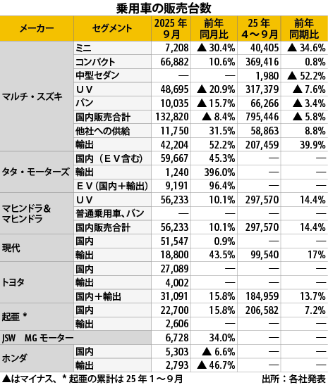 インド9月の乗用車販売、首位スズキは8.4%減車両統計自動車インドの主要乗用車メーカー9社の2025年9月の国内新車販売台数(出荷ベース)が3日までに出そろった。前年同月の実績を公表している6社のうち、4社がプラス…
