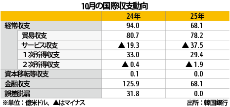 韓国経常収支68億ドル黒字、連休で黒字幅縮小経済マクロ経済統計韓国銀行(中央銀行)が5日発表した2025年10月の国際収支動向(速報値、FOBベース)によると、海外とのモノやサービスなどの取引状況を表す経常収支は68億1,…