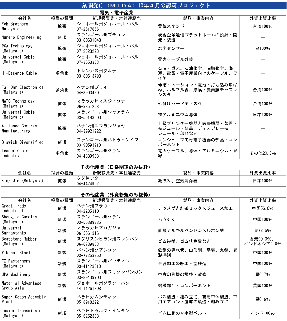 マレーシアMIDA投資認可(09年4月)経済マクロ経済統計その他製造設備投資建設・プラント政策・法律・規制 工業開発庁(MIDA)09年4月の認可プロジェクト ---------------------- 会社名 投資の種類 新規投資先 製品・事業内容 外資出資比率 本社連絡先 …